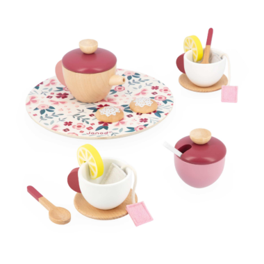 It's tea time ! Vous prendrez bien une tasse de thé ou une tisane accompagnée d'un biscuit nappé ? Ce set en bois de service à thé met l'eau à la bouche ! De quoi faire un gouter chic et raffiné en duo ! Ce jeu d'imitation fleuri pour les enfants à partir de 2 ans est tout à fait original. Il se compose d’une théière en bois naturel réhaussé de couleurs roses gourmandes, d’un sucrier assorti, de deux tasses faites pour recevoir les jolis sachets de thé en feutrine, de 2 petites cuillères et de rondelles de citron qui tiennent sur les tasses ! Les couvercles sont tous amovibles pour plus de réalisme. Pour mettre en valeur ces éléments, nos petits hôtes pourront présenter les tasses sur 2 soucoupes et l'ensemble sur le plateau en bois délicatement décoré de motifs floraux poétiques. Pour cette petite pause gourmande, quoi de mieux que 2 biscuits pour accompagner le thé. Ce service à thé est parfait pour accompagner les dinettes ou les cuisines pour enfants. Il permet de jouer en développant l'imagination des plus petits ! Il est fabriqué en bois FSC®.