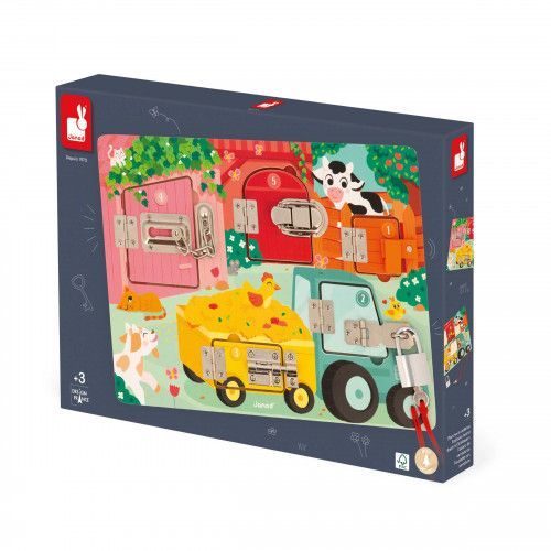 Serrures, verrous, clés ... les enfants adorent ! Alors quelle belle idée de leur proposer leur propre planche à cadenas pour découvrir, réfléchir, expérimenter avec les animaux de la ferme ! Pour découvrir tous les secrets de cette jolie busy board en bois, il faudra réussir à ouvrir les 5 portes fermées grâce à 5 systèmes différents : Clé, loquet, entrebâilleur à chaine, attache à bascule et verrou ! Chaque porte comporte sa propre couleur et son propre chiffre et celui-ci correspond au nombre de bébés animaux cachés derrière la porte ! De quoi s'amuser de plein de manières différentes ! Apprentissage des couleurs, des chiffres, connaissance des animaux de la ferme et de leurs bébés et développement de la dextérité et de la logique. Cette jolie planche d'activités éducatives en bois FSC® est idéale pour les enfants dès 3 ans.