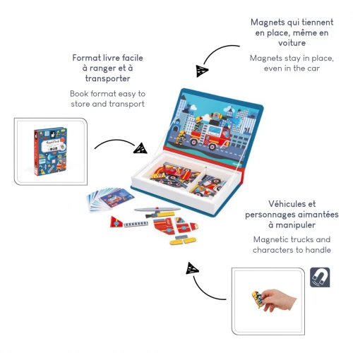 Pimpon, pimpon, le feu est venu se glisser dans les Magnéti’book ! Ce jeu magnétique ravira les enfants à partir de 3 ans leur permettant de se transformer en vrais petits pompiers. Ce jeu éducatif stimulera l’imagination de votre bambin, lui permettant alors de se raconter une ribambelle de petites histoires grâce à la scène magnétique et aux 60 aimants à assembler. Suivre les modèles fournis et imaginer ses propres personnages, les enfants sont totalement libres. Les magnets pouvant être mixés, la créativité est sans limite. Ce livre magnétique se compose de 60 magnets et 18 cartes modèles aux couleurs des soldats du feu et de leurs véhicules. Par les mers, ou dans les cieux, le véhicule idéal pour contrer le feu prendra vie sous les mains de votre enfant. Une fois crée, la rêverie est en pleine action ! Le format livre est très pratique, facilement transportable pour que son imagination ne s’arrête pas aux portes de la maison. Ces pièces pensées pour les petites mains viendront parfaire la motricité de vos petits bambins. Ce coffret magnétique vient rejoindre la grande famille des Magnéti’book, des jouets aimantés éveillant curiosité et créativité. Ce jeu éducatif magnétique est composé de carton certifié FSC™ ainsi que de matériaux contrôlés.