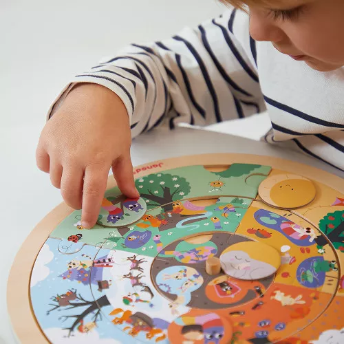 Suivre les jours et les saisons n'a jamais été aussi facile ! Avec ce jeu de Cherche et Trouve sous forme de puzzle, les enfants dès 4 ans apprennent à se repérer dans le temps et à faire preuve d'observation. C'est un jeu éducatif et évolutif, avec une activité sur chaque face ! Au recto, c'est le déroulement d'une journée qui s'offre à votre enfant : il peut alors assembler les pièces du puzzle en bois, avant de les faire tourner pour bien les faire correspondre sur 3 niveaux. Ici, votre bambin apprend comment s'organise son quotidien et les différentes phases du matin au soir. Au verso de ce puzzle éducatif, ce sont les saisons qui sont à portée de main : votre enfant peut là aussi assembler les pièces et les manipuler pour reconstituer les 4 saisons. C'est un chouette moyen de rendre la notion de temps, plutôt abstraite pour les tout-petits, très concrète grâce à la manipulation ! Sur chaque face de ce puzzle en bois, votre enfant découvre de jolis décors en pleine nature ainsi que de petits animaux. Et que c'est amusant de faire tourner les pièces ! Ce jeu éducatif n'est pas qu'un simple puzzle rond, c'est aussi un jeu de Cherche et Trouve qui favorise la concentration et l'observation des plus petits ! Placez le cache fourni sur l'une des faces, et invitez votre enfant à retrouver les 10 éléments cachés sur chaque puzzle, soit 20 en tout. Malin, les 3 ouvertures présentes sur le cache permettent de restreindre la zone à observer : idéal pour développer l'acuité visuelle ! Ce jeu éducatif pour les enfants en maternelle se compose de : 1 support rond en bois, 12 pièces de puzzle en bois, 20 cartes et 1 cache en carton. Ce puzzle d'observation invite les enfants dans l'univers amusant qu'est le jardin, cet environnement qui fourmille de curiosités et évolue en fonction du temps et des saisons. Vous pouvez accompagner votre enfant dans ses apprentissages en le guidant dans la réalisation du puzzle, ou bien en l'invitant à observer la nature par la fenêtre ou lors de votre prochaine sortie, pour encore mieux faire le lien avec les illustrations du support. Ce jeu de Cherche et Trouve sur le thème du jardin est composé de bois et de carton certifié FSC™. Il fait partie de la gamme pédagogique Janod, développée en collaboration avec une professeure des écoles afin de coller au mieux aux apprentissages et aux programmes de chaque niveau.