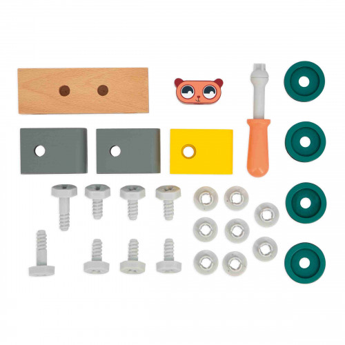 Petit ours est prêt pour le bricolage ! Cette voiture à construire en bois invite les enfants à partir de 2 ans à développer leur imagination et leur motricité fine en assemblant les pièces, puis "Roulez jeunesse" ! Ce jeu de construction est composé de 9 pièces en bois et de 16 éléments de visserie en plastique (vis, écrous, inserts). Un tournevis est également inclus, ainsi qu'une carte modèle pour accompagner les apprentis bricoleurs dans l'assemblage du véhicule. Les vis sont crantées pour toujours mieux imiter les vraies et permettre une manipulation facile par les petits. Quel bonheur de pouvoir bricoler comme les grands ! Un jeu de bricolage est idéal pour les aider à développer leur motricité fine, leur dextérité et leur précision ! Et une fois la voiture construite, celle-ci est prête à rouler ! À bord de sa voiture jouet jaune et grise, notre compère l'ours viendra-t-il sur le chantier pour une petite visite, ou fera-t-il la course avec ses copains ? De folles aventures s'offrent à votre enfant avec cette voiture à construire. Composée de bois certifié FSC™, cette voiture à bricoler ours fait partie de notre collection de jouets d'imitation bricolage : Brico'Kids.
