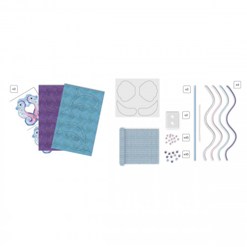 Ces baguettes sont de véritables trésors sous-marins ! Avec ce kit créatif, les enfants dès 7 ans réalisent 3 baguettes magiques sur le thème des sirènes. Pour que les étoiles de mer scintillent ou que résonne le chant des vagues, il suffit d'un peu de magie ! Mystérieuse sirène ou roi d'un royaume sous-marin seront ravis de compléter leurs déguisements ou de s'imaginer des tas d'histoires avec leurs propres baguettes. Ce coffret créatif permet aux enfants de développer leur imagination et leur créativité, mais aussi leur dextérité et leur précision. Sont présents dans le coffret : 4 planches prédécoupées (2 pailletées bleues/violette, 1 imprimée et 1 transparente), de la tulle bleue, 45 sequins coquillages, 45 sequins ronds, 2 perles irisées, 3 baguettes en bois teinté, 1 ruban de sequins irisés, 3 rubans de satin (rose, bleu, violet), 1 fil élastique et 3 carrés de mousse autocollante. Un livret avec modèles et instructions est aussi fourni, pour que les petits bricoleurs progressent à leur rythme. Les effets irisés et nacrés et les coloris rappelant les reflets aquatiques immergent toute la famille dans un monde enchanteur. Plongez dans l'univers de la collection "Magic Ocean", des kits de loisirs créatifs pour enfant sur le thème des profondeurs marines, pour des après-midis créatifs bercés par le son des vagues !