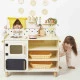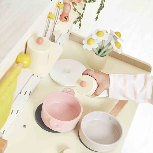 Les invités arrivent, vite, tous en cuisine ! Avec leur grande cuisine en bois, les enfants imaginent de délicieuses recettes aux fourneaux et imitent les plus grands, à partir de 3 ans. Équipée comme une vraie et avec 16 accessoires, cette cuisine jouet est parfaite pour jouer à la dinette et inventer toute sorte d’histoires et de petits plats ! La taille de cette kitchenette a été pensée pour offrir une belle surface de jeu : elle mesure 77 x 29,5 x 77 cm. Son style est inspiré de la cuisine de grand-mère, avec tous les indémodables que l’on adore retrouver encore aujourd’hui : 2 planches à découper, 1 poêle, 1 casserole, 1 écumoire, 1 louche, 1 salière, 1 poivrière, 2 pots à épices, 2 grandes panières, des rideaux, 1 vase avec 1 bouquet de 5 fleurs, 1 plante verte. Avec tous leurs ustensiles, les enfants préparent les ingrédients, les font mijoter et les assaisonnent selon leurs goûts, le tout dans leur propre cuisine rien qu’à eux. Mais ce n’est pas tout ! La cuisinière est aussi équipée de 2 fours avec portes magnétiques (parfait pour faire griller de la viande et cuire un bon gâteau en même temps), d’un évier avec boutons rotatifs pour le robinet, de plaques de cuisson avec boutons rotatifs sonores, de deux porte-torchons et d’une fenêtre. Parfait pour rincer les légumes ou laver la vaisselle avec une jolie vue ! La richesse des détails et le grand format de cette cuisine en bois sont un vrai coup de cœur ! Un autre de ses atouts : les charnières inédites des fours, anti-casse et pensées pour un assemblage facile. Il ne reste plus qu’à se mettre aux fourneaux pour faire un gratin de pommes de terre gourmand ou une bonne tarte aux pommes ! Cette grande cuisine pour enfant est composée de bois issu de forêts gérées durablement, certifié FSC™. Elle fait partie de notre collection Mamie Soleil : un ensemble de jouets d’imitation inspirés de la cuisine de grand-mère, imprégnés d’émotions et de souvenirs d’enfance.