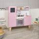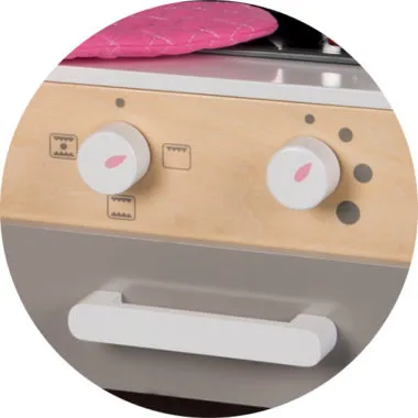 Avis aux cordons bleus en herbe ! La Maxi Cuisine Macaron est parfaite pour saisir, mijoter et préparer des petits plats pleins de fantaisie et d'imagination pour toute la famille ! Cette cuisine en bois en version XL, c'est le rêve de tous les enfants qui aiment faire comme papa et maman dans la cuisine ! Ils vont avoir beaucoup d'idées et tous les accessoires nécessaires pour préparer les meilleurs des petits plats ! Avec ce beau jouet d'imitation, on retrouve les accessoires suivants : une patère pour suspendre les 3 cuillères en métal, une poêle en métal, une casserole avec son couvercle en métal, un gant, un œuf au plat et sept boites d'aliments en carton (cacao, sucre, jus d'orange, farine, fromage, lait et riz). Pour être encore plus réaliste, cette cuisine est équipée d'une plaque à induction sonore à led : il suffit d'appuyer une fois sur les boutons rouges pour que les plaques s'allument, puis une deuxième fois pour entendre le son de l'eau qui bout. Le son et les plaques à induction s'éteint automatiquement au bout de 30 secondes ou si vous appuyez une troisième fois sur les boutons rouges. Cette magnifique cuisine toute équipée comprend également un four, un micro-ondes, un placard et un frigo avec portes magnétiques, 3 boutons rotatifs avec bruitage, un évier en inox, une horloge et une ardoise pour écrire la liste de courses ! Hauteur du plan de travail : 57 cm. Il est temps de passer à table !