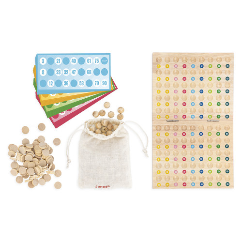 Un grand classique revisité avec style ! Avec ce jeu de bingo coloré en bois, les enfants apprennent à reconnaître les chiffres et à développer leur concentration tout en créant des moments de complicité en famille. À chaque tirage, ils observent, repèrent et placent les bons jetons sur leur grille. Le premier à la compléter crie "Bingo !" et remporte la partie. Un petit sac en coton est inclus pour tirer les numéros en tout discrétion... et pour tout ranger facilement une fois la partie terminée ! Le jeu comprend 90 boules numérotées, 90 pions en bois à placer sur les grilles et 48 cartes imprimées prêtes à être complétées. Un jeu simple, éducatif et convivial, parfait pour les premières découvertes des chiffres. Adapté aux enfants dès 6 ans, ce jeu est fabriqué à partir de bois FSC™.