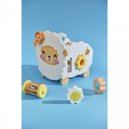 Qu'il est mignon ce mouton en bois à l'allure champêtre ! Fleurs, abeille, papillon… toute la nature est au rendez-vous ! Ce mouton multi-activités propose de nombreux jeux qui vont plaire aux enfants dès 12 mois. Sur le devant, niché au niveau de sa tête, se trouve un petit oiseau magnétique que l'enfant peut s'amuser à enlever et à remettre à sa guise. Sur un des côtés, on retrouve une boîte à forme où bébé peut y insérer 3 fleurs. Cette activité va demander un temps de réflexion aux tout-petits pour savoir comment placer ces formes. Le petit plus ? Chaque fleur possède une surface unique à explorer : un miroir, une partie à gratter et un plexi transparent pour voir la vie en orange ! Sur le côté opposé, on retrouve un petit labyrinthe avec une adorable abeille en bois. Le défi pour bébé ? La faire glisser le long de son chemin ! Sur le dos du mouton, on peut y visser un papillon, permettant aux petits de faire leurs premières expériences avec la rotation. Juste à côté, un petit emplacement est prévu pour accueillir un hochet à grelot : bébé pourra le saisir, le secouer et écouter son doux tintement. C'est parfait pour stimuler l'ouïe dès le plus jeune âge. Malin, les 6 accessoires qui composent ce jouet peuvent aussi se ranger à l'intérieur ! Ce beau jouet d'éveil est fabriqué en bois FSC™.