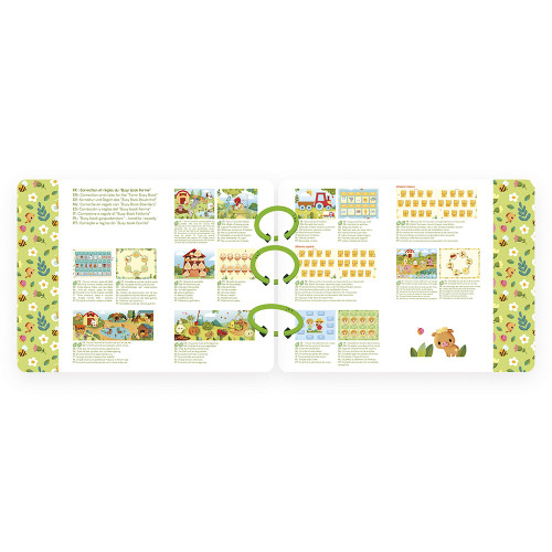 Bienvenue à la ferme ! Ce busy-book composé de 20 pages d'activités fait découvrir aux tout-petits dès 3 ans la vie à la ferme. Et il s'en passe des choses là-bas ! Les animaux gambadent dans les prés, les poussins sortent de leur coquille, les légumes grandissent sous le soleil… Les enfants ont mille choses à découvrir ! Ils y retrouvent les animaux stars de la ferme : la poule, la vache, le cochon, le lapin... Et même le dindon ! Au fil des pages, les enfants se familiarisent avec leurs habitats et observent les scènes de la vie quotidienne. Chaque activité invite à manipuler, observer et nommer pour apprendre en s’amusant. Au total, 158 pièces sont à placer dans le livre ! Les illustrations douces et vivantes ont été pensées pour éveiller la curiosité, enrichir le vocabulaire et développer la motricité fine. Et ce n’est pas tout : les plus grands pourront aussi s’initier aux chiffres et à l’alphabet, en majuscules et minuscules. Un vrai coup de pouce pour développer le langage et les premières notions scolaires. Pratique et évolutif, ce livre d'activités est relié par 3 anneaux en plastique détachables, permettant aux parents de sélectionner les pages les plus adaptées à l’âge et au rythme de l’enfant. Une belle façon de faire grandir le livre avec lui ! Ce jeu d’éveil est parfait pour des moments de jeu autonomes. Grâce à son format livre, il s'emporte facilement partout ! Dimensions : 27 x 21 cm. Ce busy-book est composé de carton FSC™. Place à la découverte !