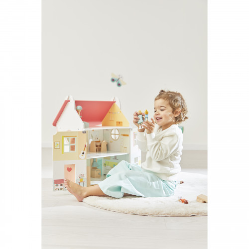 Voici une jolie maison de poupées sur 3 étages au toit couleur corail et aux illustrations printanières ! En ouvrant les grandes portes magnétiques, on découvre une maison de poupées pleine de charme et de détails ! On retrouve les différentes pièces de la maison : un salon, une cuisine, une salle de bain... Mais où est le lit ? Pas de panique, il se trouve au 3e étage ! Pour l'apercevoir, il suffit de retirer le toit ! Malin, ce dernier est amovible pour faciliter l'accès à l'étage supérieur ! Les briques corail, les oiseaux et les arbustes créent un univers vivant où les enfants pourront inventer mille histoires. C'est parfait pour stimuler l'imagination ! Ils découvrent chaque pièce de la maison, installent le mobilier et font vivre les 4 personnages en bois. La maison est également compatible avec des personnages mesurant jusqu’à 11,5 cm environ. Elle est livrée avec 11 accessoires que les enfants pourront s'amuser à aménager : une armoire avec portes ouvrantes, un lit avec couverture, une coiffeuse, une baignoire, un canapé, une lampe, une table, deux chaises et une cuisine. Assemblage simple pour des heures de jeu créatif. Ce jouet d'imitation est composé de bois certifié FSC™.