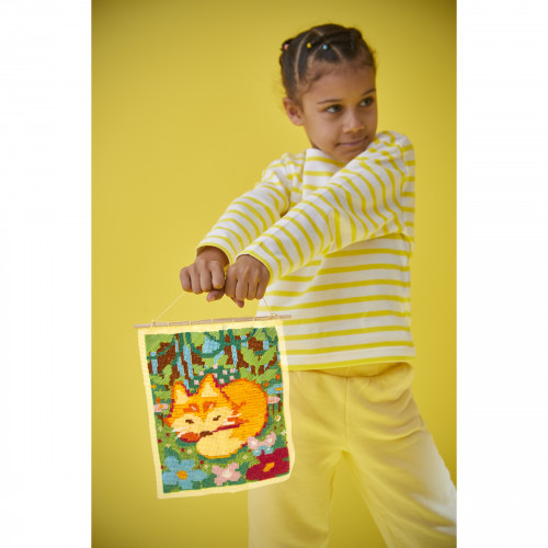 Le canevas fait son grand retour ! Indémodable, cet art créatif est aussi accessible aux enfants ! Dès 8 ans, avec ce canevas petit renard aux motifs simples et aux couleurs vives, les enfants peuvent s’amuser tout en développant leur motricité fine. Facile à manipuler, ce canevas invite à suivre les lignes sur l'imprimé et remplir les espaces avec les couleurs. Un livret avec des instructions est inclus, pour réaliser son oeuvre pas à pas. Avec ce canevas, les enfants deviennent de vrais artistes : un fil vert par-ci, un fil brun par-là… et doucement, les feuilles de la forêt prennent forme autour du petit renard endormi. Le petit plus : des strass sont inclus pour ajouter une finition scintillante à cette jolie scène, ainsi qu'une touche de créativité ! Ce kit stimule aussi la concentration et la patience, offrant un vrai moment de satisfaction une fois le canevas terminé. Vous pouvez compter 2 jours d'activité pour réaliser ce canevas dans son entièreté : c'est parfait pour occuper votre bambin de façon ludique ! Grâce à la baguette en bois présente dans le kit, vous pouvez le suspendre et en faire un objet de décoration. Cet adorable petit renard trouvera parfaitement sa place dans la chambre de votre enfant ! Issu de la collection "Les Ateliers déco", ce kit contient : 1 toile imprimée à broder entièrement, 6 échevettes de fil (6 couleurs), 1 aiguille pour laine, 1 aiguille pour fil, 1 baguette en bois 1 planche de 40 strass autocollants et 1 livret explicatif (12 pages).