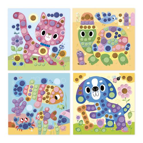 Des mosaïques mousse à gogo ! Les enfants dès 3 ans vont adorer personnaliser 4 tableaux à l'aide de jolies mosaïques rondes en mousse. Avec ce kit créatif, les illustrations vont briller de mille couleurs ! Comme des autocollants, les mosaïques présentes dans ce coffret créatif ont de nombreux atouts : elles sont de différentes tailles et couleurs pour offrir une activité riche et variée. Certaines d'entre elles sont même à paillettes ! Leur format a été pensé pour les petites mains : elles se décollent facilement, ce qui rend la manipulation simple et agréable. Coller des mosaïques est une activité manuelle idéale pour développer la motricité fine, apprendre à être précis et suivre un modèle tout en s’amusant. Les 4 tableaux à embellir représentent des animaux trop mignons : un chat, un chien, une tortue terrestre et des poissons. Ce coffret est parfait pour les enfants en maternelle grâce à la simplicité de l’activité et à la taille adaptée des gommettes. En décrivant les scènes de ces petits amis, les enfants enrichiront leur vocabulaire. Le coffret contient : 4 tableaux de 20 x 20 cm, 5 mosaïques mousse de gommettes rondes et un livret avec instructions et modèles. Comptez environ 10 minutes pour décorer chaque tableau. Une idée cadeau originale pour un mini-artiste !