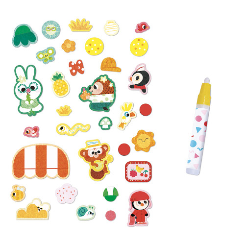 Magie et créativité pour les tout-petits ! Ce coffret propose deux activités complémentaires pour éveiller la curiosité et développer la motricité fine dès 18 mois. Avec le feutre magique à remplir d’eau, l’enfant passe sur les zones blanches des tableaux et découvre des couleurs cachées… puis, comme par magie, elles disparaissent en séchant ! Une activité fascinante qui peut être recommencée à l’infini. Mais ce n’est pas tout : le kit inclut aussi des tableaux à compléter avec des feutrines autocollantes repositionnables. L’enfant commence par trier les feutrines par couleur dans la boîte prévue à cet effet, puis les place sur les emplacements correspondants pour créer des décors colorés. Une manière ludique d’apprendre les couleurs tout en stimulant la concentration et la précision. Les illustrations pleines de douceur mettent en scène des animaux adorables dans des univers joyeux : des souris parties pour une virée à deux en bateau sous le soleil, un concert improvisé à la belle étoile, un petit cochon jardinier qui arrose ses plantes ou encore un pique-nique entre amis. De quoi inventer des histoires et enrichir son vocabulaire tout en s’amusant ! Ce coffret contient 2 tableaux recto-verso à colorier avec le feutre magique, 4 tableaux à compléter avec des feutrines prédécoupées, un pinceau à réservoir d’eau, une boîte de tri des couleurs intégrée et un livret avec les instructions et les modèles. L’activité dure environ 1 heure et permet de développer la motricité fine, la concentration et la reconnaissance des couleurs.