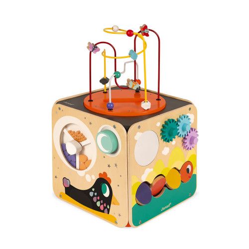 Un busy-board à croquer pour la chambre de bébé ! Idéale pour divertir et stimuler les petits, dès 18 mois, cette planche d’activités en forme d’ourson propose une multitude de jeux à manipuler. Au total, plus de 20 jeux d’éveil sont répartis sur ce panneau d’activités, pour favoriser le développement de la motricité et de la dextérité des enfants. Au programme des réjouissances : 2 yeux rotatifs, 2 pommettes en feutrine toutes douces, 1 pochette avec fermeture éclair cachant un petit lapin, 1 lacet à nouer, 1 sablier rotatif, 1 roue dévoilant les chiffres de 0 à 9 pour apprendre à compter, 1 labyrinthe à explorer, 1 museau rotatif sonore, 2 bretelles avec différents systèmes de fermeture (métal ou scratch), 1 castagnette, 1 sonnette, 1 serrure métallique, 1 miroir caché, 1 boulier coloré, des textures en silicone cachées, des engrenages, des élastiques à attacher … Vous l’aurez compris, ce sont des heures de découvertes qui s’offrent aux petits curieux ! Que de plaisirs tactiles et sonores au service de la motricité fine de bébé. Et des ouvertures diverses et accessibles, pratiques pour s’entrainer à s’habiller ou à faire ses lacets. C’est un jouet d’éveil polyvalent, complet et parfait pour des moments de jeu autonomes. Vous pouvez facilement fixer le busyboard en bois au mur. Il saura trouver sa place dans une chambre d’enfant, grâce à son style poétique et ses belles couleurs. Bébé retrouvera tous les animaux les plus mignons : l’abeille, le lapin … Et l’ours blanc, bien sûr ! Dimensions : 47,5 x 60 cm. Issue de notre collection de jouets d’éveil en bois Pure, ce busy-board ourson est composée de bois certifié FSC™. Que de découvertes en perspectives !