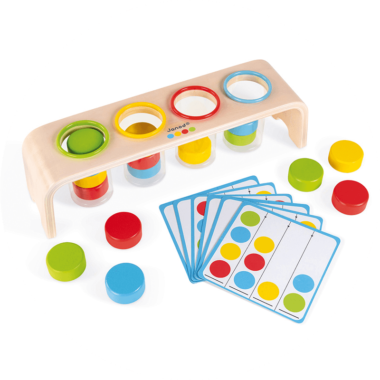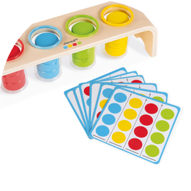La découverte des couleurs est une étape fascinante pour les enfants ! A partir de 2 ans, ils pourront se familiariser avec 4 couleurs principales, le rouge, le bleu, le vert et le jaune grâce à ce joli jeu de tri en bois de la gamme Essentiel. Pour les plus petits, on s'amuse reconnaitre les mêmes couleurs et à les associer en mettant les 16 grosses pièces en bois massif de couleur dans le tube en plastique dédié. Quand les associations sont maitrisées, on peut passer au deuxième niveau de jeu. L'enfant doit reproduire les modèles proposés sur les 6 cartes recto-verso incluses. Les tubes de couleurs différentes sont posés sur un joli support arrondi en bois naturel. Très astucieux, ceux-ci sont interchangeables pour apporter une difficulté supplémentaire et éviter la répétition de l’activité. Ce jouet développe la coordination main / œil, la découverte des formes et des couleurs. Les pièces sont peintes à l’eau.