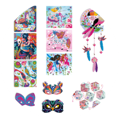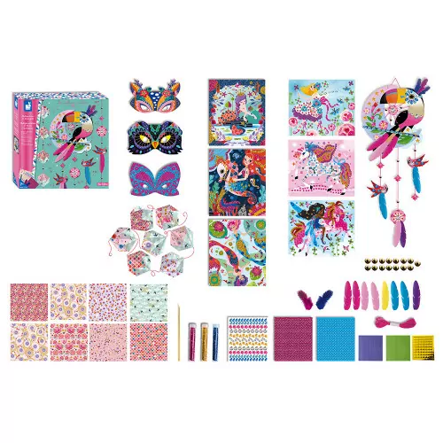 Gratter, coller, plier ... Voici un coffret renfermant de nombreuses activités de loisir créatif pour les enfants à partir de 7 ans ! On y retrouve tout le nécessaire pour s'amuser autour du thème des jolies décorations : 3 masques à gratter, idéal pour développer la motricité fine, un attrape-rêve et 1 guirlande en origami diamant pour décorer sa chambre, 6 tableaux colorés à customiser avec des mosaïques ou des paillettes. Ce kit complet d'art créatif est idéal pour développer la dextérité et la créativité. Il permet d'occuper de manière intelligente les enfants qui pourront se concentrer pendant un bon moment sur une activité dont ils seront fiers. C'est également une super idée pour amuser les copains lors des fêtes d'anniversaire !