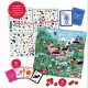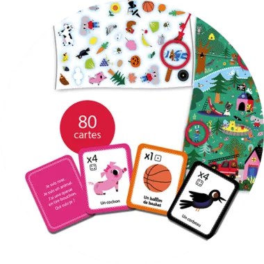 Ce joli jeu de 80 questions permettra à vos enfants d'apprendre les couleurs et de commencer tout doucement à compter. On pioche une carte, on trouve l'élément grâce aux indices de la devinette et on le retrouve sur le plateau ! Ex : Je suis un oiseau noir et blanc qui annonce le printemps ... L'hirondelle ! Oui ! Et il y a 8 hirondelles à retrouver sur le plateau ! Celui-ci est double face et modulable, il est composé de 4 parties amovibles, ce qui permet d'avoir 24 combinaisons possible. Le jeu se compose de 80 cartes et de 8 jetons. Règles du jeu uniquement en français. A partir de 3 ans. Durée moyenne d'une partie : 20 minutes.