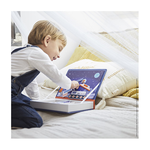 Connaissez-vous les Magnéti'book ? Ces livres magnétiques nomades et éducatifs sont adorés par les petits et les grands ! Le principe ? Un coffret magnétique renferme de nombreux éléments aimantés à associer en suivant les modèles ou en laissant parler sa créativité ! Ce jeu en carton transportera les petits à partir de 3 ans dans l'univers fascinant de l'espace et des planètes grâce à 52 magnets et 18 cartes. A l'intérieur, une scène magnétique permet de recomposer le véhicule spatial indiqué sur la carte à l'aide des magnets. L'enfant pourra également s'amuser à mélanger les différentes pièces entre elles pour créer des scènes rigolotes puisqu'elles sont toutes interchangeables ! Permet à l'enfant d'améliorer son imagination et sa motricité fine. Ce produit est composé de matériaux certifiés FSC® et de matériaux contrôlés.