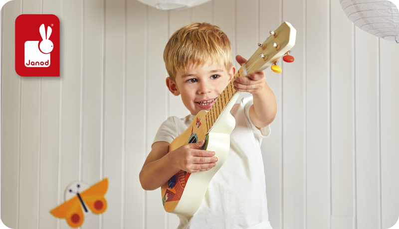 Prêts à faire danser la foule ? Voici notre ukulélé pour enfants, un jouet instrument de musique qui favorise l'imagination et l'éveil musical des petits dès 3 ans. Avec ses 4 cordes en nylon, tel une petite guitare, il offre un son enjoué qui invite à l'expérimentation musicale. Ce ukulélé en bois est facile à prendre en main, même pour les plus petits, grâce à sa taille adaptée. Un jeu de cordes supplémentaire est inclus dans la boîte. Avec ce jouet musical, les enfants explorent le monde de la musique, développent leur dextérité et même composent leurs propres mélodies ! De plus, ce ukulélé leur permet d'imiter les plus grands en se rêvant star de la chanson ! Avec son design pétillant aux couleurs de la jungle, ce jouet d'imitation séduira les enfants et les parents. En résumé, cette petite guitare est le cadeau parfait pour les petits musiciens en herbe. Elle offre une expérience musicale ludique et éducative, tout en étant un bel objet dans la chambre de votre enfant. Ce jouet instrument de musique fait partie de notre gamme Gioia, une invitation à l’éveil musical dans la joie, permettant aux tout-petits de découvrir le monde des sons de manière ludique et sous le signe du partage. Jouet en bois certifié FSC™.