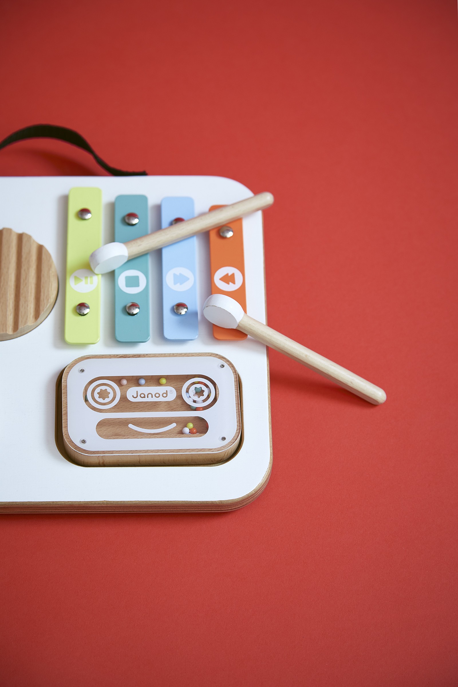 Attention les oreilles, bébé fait son show ! Voici une table musicale en bois aux couleurs attrayantes spécialement conçue pour les plus petits ! Parfaitement adaptée aux petites mains, elle regroupe divers instruments de musique avec lesquels les tout-petits à partir de 12 mois vont pouvoir s'amuser ! Elle est composée d'1 gratte-gratte, d'1 tambour, d'1 cymbale rouge, d'1 xylophone à 4 notes , d'1 cassette-hochet remplie de billes et de 2 baguettes. Grâce à un rangement malin sur le dessus de la table, ces dernières s'emportent facilement partout ! Cette table invite les tout-petits à explorer, taper, frotter, écouter… et surtout à s’émerveiller ! Elle stimule l'éveil musical, la motricité fine, la coordination et l’imagination. Un vrai terrain de jeu musical pour les premières improvisations ! Trop pratique, avec sa poignée et son petit format, elle peut suivre bébé partout ! Cette table musicale spéciale bébé fait partie de la gamme Confetti, une gamme complète de jouets d'imitation musicale avec des motifs Pop N' Rock ! Plein de couleurs et de joie, Les jouets musicaux Confetti permettent aux plus jeunes musiciens de s'initier aux joies de l'improvisation musicale. Ce jouet d'imitation musical est composé de bois FSC™. Un, deux, trois... musique !