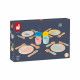 Stasera tutti a cena in famiglia in un ristorante chic e alla moda, con la bellissima cucina in legno Reverso double-face! Colori tenui, uno stile unico e moderno con forme arrotondate, mille possibilità di gioco grazie alle attività offerte su ogni lato della cucina, tutto questo combinato con tanti accenti graziosi ... è il sogno di tutti gli apprendisti cuochi e perfetti padroni di casa! Il suo lato double-face è una vera risorsa! Permette di offrire ai bambini dai 3 anni un grande parco giochi, da soli o con gli amici, inventando storie sia sul lato cucina che sul lato tavola imbandita! Questa cucina Cooker Reverso è piena di attrezzature: un lavello in metallo e una piastra a induzione sonora e luminosa. Basta premere i pulsanti rossi una volta per far accendere le piastre, poi una seconda volta per sentire il suono dell'acqua bollente. Il suono e la luce si spengono automaticamente dopo 30 secondi o quando vengono premuti una terza volta. Per il massimo realismo, ci sono anche 2 manopole rotanti con effetti sonori, un forno, un forno a microonde, un armadietto con ante magnetiche. Per completare questa bellissima cucina, sono inclusi 7 accessori in metallo: 1 padella, 1 casseruola, 1 colino, 1 cucchiaio, 1 spatola, 1 schiumarola, 1 cucchiaio da pasta e infine 1 panno in tessuto. Sul retro, scopriamo il mondo della pulizia del bucato con la lavatrice, i ripiani portaoggetti, un orologio con lancette che girano e 2 pulsanti di programmazione con effetti sonori! Il suo adorabile stile arrotondato, che combina perfettamente legno naturale, verde acqua e bianco è evidenziato da questi motivi geometrici vintage. Piacerà sia ai più piccoli che ai genitori! Grazie a questo bellissimo giocattolo imitazione con un concetto originale, ai vostri bambini non mancherà nulla per immaginare mille storie fantasiose! Altezza del piano di lavoro: 50 cm.