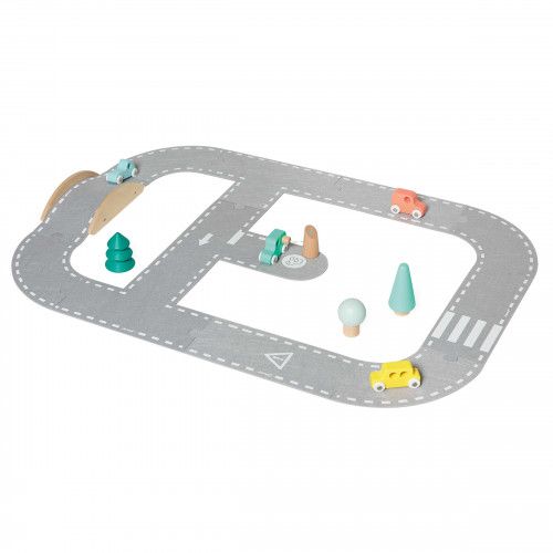 Ecco un circuito per macchinine davvero inedito! Il percorso in feltro è composto da 12 pezzi. Facile da montare per i bambini dai 2 anni in su, questo circuito è pieno di sorprese: i pezzi in tessuto sono morbidi e leggeri, un elemento sopraelevato rappresenta un ponte, un "veicolo elettrico" si collega alla stazione di ricarica grazie a un magnete e simpatici alberi in legno decorano la pista. Per divertirsi all'infinito, è possibile costruire tanti circuiti differenti! Ma attenzione a far rispettare il codice della strada ai 4 veicoli colorati del circuito! Questo gioco stimola le abilità manuali del bambino e favorisce l'immaginazione e la creatività. Questo giocattolo multisensoriale in feltro e legno FSC® fa parte della collezione Bolid.
