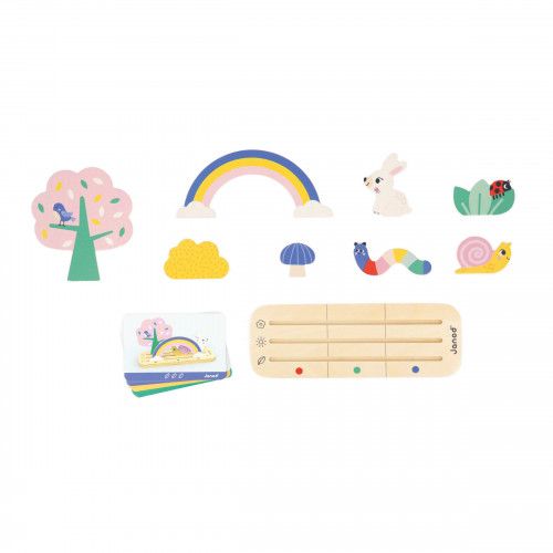 Questo magnifico gioco educativo in legno è ideale per ripassare le nozioni apprese a scuola in modo divertente! Aiuterà i più piccoli a orientarsi nello spazio arricchendo il loro vocabolario! C'è tutto l'occorrente per fare una passeggiata in giardino insieme a 8 personaggi ed elementi della natura in legno: una lumaca, una coccinella, un albero, un bruco... Aiutandosi con le 12 carte modello fronte-retro, i bambini dai 3 anni in su dovranno riprodurre una scena sul supporto in legno, acquisendo al contempo il lessico appropriato: a sinistra/a destra, davanti/dietro, a fianco di... Svilupperanno anche lo spirito di osservazione. Sono disponibili 3 livelli di difficoltà, rappresentati dai colori sulle carte. Gradualmente, i bambino passerà da 2 a 5 elementi da posizione. Questo gioco può essere usato in autonomia ma anche in coppia, con un adulto che descrive la scena del giardino da riprodurre. In più, i puntini colorati presenti sul supporto in legno e sulle carte modello aiuteranno il bambino a svolgere l'attività. Inoltre, questo gioco educativo in legno è simpatico e attraente! I bambini si divertiranno a scoprire e manipolare i piccoli animali e gli elementi del giardino variopinti! Il libretto di istruzioni incluso permetterà di usare al meglio questo gioco rivolto ai bambini del primo anno della scuola materna. Questo gioco fa parte di una collezione pedagogica sviluppata in collaborazione con un'insegnante di scuola materna affinché sia aderente ai programmi educativi di ciascun livello. Questo gioco è fabbricato in legno e cartone FSC®.