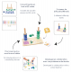 È più facile imparare a scomporre i numeri quando l'attività è divertente! 2 simpatici bruchi aiuteranno i più piccoli a capire la composizione dei numeri e confrontare diverse quantità. Questo simpatico gioco educativo in legno, rivolto ai bambini dai 3 anni in su, semplifica la comprensione di tale nozione materializzando i numeri e manipolando elementi tridimensionali. I bambini dovranno usare i dischetti colorati che formano il corpo dei bruchi per rappresentare il numero raffigurato sulle 33 carte del gioco. I numeri sulle carte sono rappresentati tramite scrittura in cifre, dita della mano o puntini di un dado. Impilando i dischetti colorati sul supporto in legno, il bambino imparerà quanti aggiungerne o rimuoverne per ottenere una data quantità. Al termine di questa prima attività sarà possibile introdurre le nozioni "maggiore di" e "minore di" grazie alle apposite carte. Il libretto di istruzioni incluso permetterà di usare al meglio questo gioco rivolto ai bambini del primo anno della scuola materna. Questo gioco fa parte di una collezione pedagogica sviluppata in collaborazione con un'insegnante di scuola materna affinché sia aderente ai programmi educativi di ciascun livello. È fabbricato in legno e cartone FSC®.
