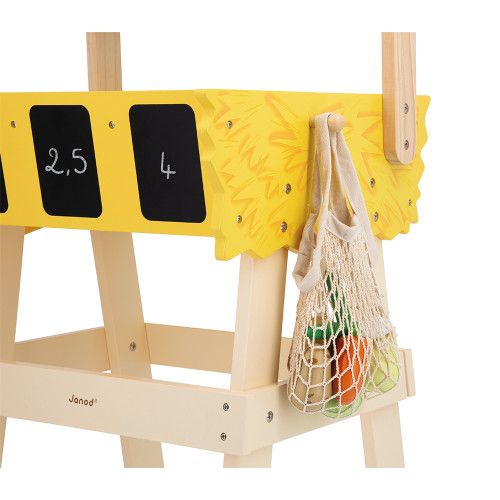 Il mercato dei piccoli agricoltori è aperto! La nostra bancarella in legno Farm Market permette ai bambini dai 3 anni in su di vestire i panni di un vero fruttivendolo. Questo magnifico giocattolo di imitazione è dotato di numerosi accessori per un'esperienza di gioco gratificante e realistica. Ben 58 accessori completano questa bancarella per bambini: per prima cosa la frutta e la verdura fresca (3 carote, 3 patate, 3 porri, 3 fragole, 3 mele e 3 pere), poi i 5 alimenti confezionati (piselli, farina, latte, succo di mela e formaggio), quindi gli strumenti indispensabili per ogni buon commerciante (1 orologio, 1 bilancia, 1 registratore di cassa con 9 banconote e 12 monete, 1 lavagnetta con 2 gessetti), e infine l'essenziale per la spesa (6 sacchetti di carta per avvolgere frutta e verdura e 2 retine in tessuto). Grazie ai 6 scomparti di questa bancarella in legno, il bambino potrà disporre la frutta e la verdura a suo piacimento. Per un maggiore realismo, gli scomparti hanno un lato in ardesia su cui scrivere il prezzo di ogni articolo! Usando l'orologio o la lavagnetta, gli apprendisti negozianti potranno indicare gli orari di apertura del negozio e le promozioni in corso! Proprio come gli adulti, i piccoli commercianti potranno avvolgere le verdure nei sacchetti di carta prima di consegnarle ai clienti. Inoltre, sono incluse anche 2 retine della spesa per trasportare tutti gli acquisti: pratiche e riutilizzabili, proprio come quelle vere! La bancarella è dotata anche di 3 pratici ganci in legno per appendere i sacchetti o altri accessori. Un giocattolo di imitazione in legno perfetto per immaginare storie sempre nuove e favorire la condivisione! Inoltre, permette di imparare a organizzare i prodotti sullo scaffale o calcolarne il prezzo. Grazie a questa piccola bancarella, i bambini svilupperanno la socievolezza e le abilità cognitive, nonché l'immaginazione e il vocabolario! Questo giocattolo di simulazione è ideale anche per imparare a fare la spesa e organizzare la dispensa. Lunghi momenti di gioco attendono i bambini: siamo certi che i prodotti in vendita piaceranno a tutti! Questo giocattolo di imitazione è fabbricato in legno certificato FSC™. Scopri il mondo della fattoria di Janod