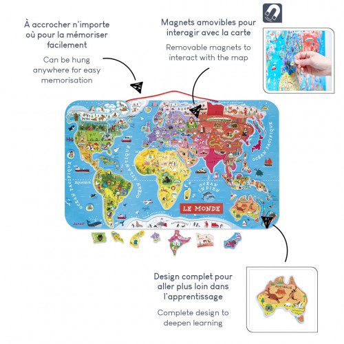 Pronto a partire per un'avventura? Vi aspetta un giro del mondo in 92 magneti! Questo puzzle magnetico del mondo permetterà ai bambini dai 7 anni di scoprire i bellissimi paesi e culture del nostro pianeta divertendosi. Ogni magnete rappresenta un paese o una regione del mondo, con il suo nome, la capitale e un'illustrazione che caratterizza quella parte del globo. I bambini si divertono a trovare la posizione di ogni paese, osservano e imparano le specificità di quest'ultimo e possono godere di questa bellissima mappa del mondo, anche appendendola al muro della loro stanza per esempio. La grande lavagna magnetica dalle forme arrotondate rappresenta il mondo con i suoi continenti, i suoi mari, i suoi oceani: il colore utilizzato per ogni regione permette di orientarsi. Un modo divertente ed educativo per scoprire il pianeta. Corda in cotone per appendere il puzzle al muro. >> Il Puzzle Magnetico del Mondo è testato e amato dai bambini, guarda qui!