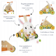 Evviva! Fate largo al coniglietto più simpatico del mondo! Il nostro coniglio bianco dagli occhi grandi è sempre pronto per una sessione di passeggiate e scoperte con il bambino! Questo carrello multiattività in legno è perfetto per i bambini da 1 anno in su, con tanti piccoli giochi su tutti e 3 i lati! Il divertimento e lo sviluppo della motricità fine e della destrezza sono garantiti dalle 9 divertenti attività del nostro coniglio birichino: circuito ad anello con le sue carote, scatola delle forme tradizionali e topolino per scivolare in un labirinto sul davanti, labirinto delle api su un lato, ingranaggi e sole sonoro sull'altro. I grandi occhi del nostro coniglio ruotano e le sue guance sono in feltro, così come le sue orecchie, per sviluppare il senso del tatto del bambino. Ecco una caratteristica divertente: le orecchie sono rimovibili grazie a chiusure in velcro, in modo da poterle riposizionare a piacimento! Questo simpatico carrello attività è particolarmente adatto per imparare a camminare. Grazie al manico regolabile in altezza (da 46 a 53 cm), può essere adattato all'altezza del bambino. Può essere utilizzato da 12 mesi a 3 anni. Per la sicurezza, è dotato di un freno sulle ruote facilmente regolabile in 3 posizioni (blocco totale, velocità ridotta, velocità normale), in modo da poterlo rilasciare gradualmente e controllare la velocità del carrello man mano che il bambino impara. Un carrello da passeggio in legno con freno è ideale per passeggiate sicure. Ha anche 4 ruote in gomma silenziose. Dare al bambino un carrello da passeggio significa che può imparare a camminare con fiducia e al suo ritmo: può alternare la passeggiata a una serie di giochi per imparare a padroneggiare l'ambiente e non stancarsi mai delle attività proposte. Tutta la famiglia amerà vedere il bambino muoversi in casa con il suo simpatico carrello coniglietto, realizzato in legno certificato FSC™. Non resta che dare un nome a questo nuovo amico!