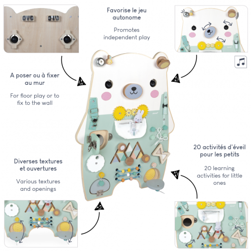 Una croccante lavagna per la cameretta del bambino! Ideale per intrattenere e stimolare i bambini a partire dai 18 mesi, questa lavagna a forma di orsetto offre una moltitudine di giochi. In totale, questa lavagna contiene oltre 20 giochi di apprendimento precoce che aiutano a sviluppare le capacità motorie e la destrezza dei bambini. Il programma comprende 2 occhi rotanti, 2 zigomi in morbido feltro, 1 astuccio con cerniera che nasconde un coniglietto, 1 laccio da annodare, 1 clessidra rotante, 1 ruota con i numeri da 0 a 9 per imparare a contare, 1 labirinto da esplorare, 1 muso rotante con suono, 2 cinghie con diversi sistemi di fissaggio (metallo o velcro), 1 nacchera, 1 campana, 1 lucchetto di metallo, 1 specchio nascosto, 1 abaco colorato, texture in silicone nascoste, ingranaggi, elastici da fissare... Come potete vedere, ci sono ore di scoperte da fare per i piccoli curiosi! Tanti piaceri tattili e acustici che aiutano a sviluppare la motricità fine del bambino. Grazie alle numerose aperture accessibili, è perfetto per esercitarsi a vestirsi o ad allacciare i lacci delle scarpe. È un giocattolo versatile e completo per l'apprendimento precoce, perfetto per il gioco indipendente. La lavagna in legno può essere facilmente fissata alla parete. Grazie al suo stile poetico e ai suoi bellissimi colori, farà sicuramente bella figura nella cameretta di ogni bambino. Il bambino adorerà tutti i simpatici animali: l'ape, il coniglio... e l'orso polare, naturalmente! Dimensioni: 47,5 x 60 cm. Dalla nostra collezione Pure di giocattoli in legno per l'apprendimento precoce, questa lavagna con orsetto è realizzata in legno certificato FSC™. Tante scoperte in serbo!