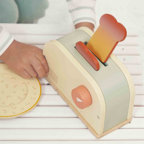 All'inizio della giornata, il profumo di pane tostato si diffonde nella casa di Nonna Sole. Questo set di imitazione è adatto ai bambini dai 3 anni in su ed è composto da un tostapane e 10 accessori: per una colazione da gourmet! Questo set in legno è perfetto per arricchire la cucina e il tavolo da gioco e stimolerà la fantasia dei bambini che amano imitare i grandi. Include : 1 vasetto di marmellata, 1 vasetto di miele, 1 piatto, 1 coltello, 1 pezzo di burro da tagliare, 2 fette di pane, 2 pezzi di feltro (marmellata e miele) e, naturalmente, un tostapane! Si mettono le fette di pane nel tostapane, si imposta la temperatura e si parte! Il toast esce dal tostapane non appena si preme il pulsante. Servito su un bel piatto, il toast è condito con burro o miele, o marmellata di fragole: yum! Azionare il tostapane, tagliare il burro o spalmare il toast stimola le capacità motorie dei bambini. Imitano le azioni degli adulti per acquisire sicurezza nella vita di tutti i giorni. Chissà, forse presto saranno in grado di preparare da soli i loro toast! Questo tostapane e i suoi accessori sono realizzati con legno proveniente da foreste gestite in modo sostenibile e certificate FSC™. Fa parte della nostra collezione Nonna Sole: una serie di giocattoli di imitazione ispirati alla cucina della nonna, intrisa di emozioni e ricordi d'infanzia.