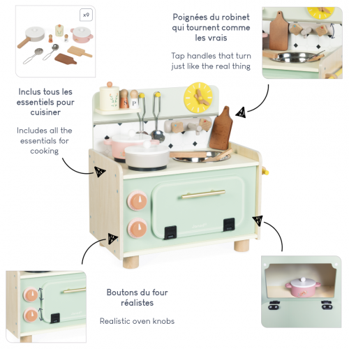 È quasi ora di mangiare, quindi è il momento di mettersi in cucina e preparare un pasto delizioso! Con la loro piccola cucina in legno, i bambini a partire dai 3 anni possono immaginare storie pazze ai fornelli e imitare i grandi. Attrezzata come una vera cucina e dotata di 9 accessori, questa cucina giocattolo è perfetta per giocare alla tavola calda e inventare ricette di ogni tipo! Le dimensioni di questa cucina sono state studiate per adattarsi a tutte le aree di gioco: misura 41,5 x 25 x 41,5 cm. Lo stile si ispira alla cucina della nonna, con tutti gli oggetti intramontabili che ancora amiamo: 2 taglieri, 1 padella, 1 casseruola, 1 schiumarola, 1 mestolo, 1 saliera e pepiera, 1 speziera. Con tutti i loro utensili, i bambini preparano gli ingredienti, li cuociono e li condiscono secondo i loro gusti. Ma non è tutto! La cucina è dotata anche di un forno con manopole rotanti e porta magnetica, un lavello con manopole rotanti per il rubinetto, teglie da forno, un porta strofinacci e un orologio. La ricchezza dei dettagli e le dimensioni compatte di questa cucina in legno sono da urlo! Un altro punto a favore è rappresentato dalle innovative cerniere del forno, resistenti alla rottura e progettate per un facile montaggio. Non resta che mettersi ai fornelli per preparare un delizioso purè fatto in casa o una croccante pasta frolla! Questa piccola cucina per bambini è realizzata con legno proveniente da foreste gestite in modo sostenibile e certificato FSC™. Fa parte della nostra collezione Nonna Sole: una serie di giocattoli di imitazione ispirati alla cucina della nonna, intrisa di emozioni e ricordi d'infanzia.