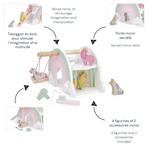 Benvenuti nella casa degli unicorni! A forma di arcobaleno, questa casa in legno è lo scenario perfetto per storie favolose per bambini dai 18 mesi in su. Fornita con 4 figurine di unicorno e 2 accessori in legno, questa casa magica incoraggia i più piccoli a sviluppare la loro immaginazione. Non aspettate oltre per scoprire tutte le sorprese di cui potranno godere! Innanzitutto, gli unicorni potranno divertirsi a scivolare ripetutamente sullo scivolo. C'è anche una bella altalena dove potranno dondolare sempre più in alto verso le nuvole! Infine, dopo una giornata trascorsa a fare i matti e a condividere la loro magia, gli unicorni amano essere coccolati! Per farlo, spazzolate la loro criniera con la spazzola in dotazione e asciugatela con il phon. E non è tutto! Gli unicorni possono entrare nella casa attraverso due porte laterali e passare sotto una cascata di frange colorate. Vi sveliamo un segreto: c'è anche una porta segreta a specchio... Qualcosa ci dice che gli unicorni, e i bambini, vivranno delle avventure pazzesche in questa favolosa casa! Manipolando i personaggi in legno e le diverse aperture, i più piccoli potranno sviluppare le loro capacità motorie divertendosi. Nel suo formato di 30 x 17 x 13 cm, questa casa di legno e i suoi personaggi sono molto originali! Il tutto è realizzato in legno proveniente da foreste gestite in modo sostenibile e certificate FSC™. A Janod, gli unicorni sono intelligenti e usano la magia per mantenere i loro segreti. Impetuosi e iconici, si evolvono in un universo poetico di colori senza tempo. Lasciate che la magia si compia!