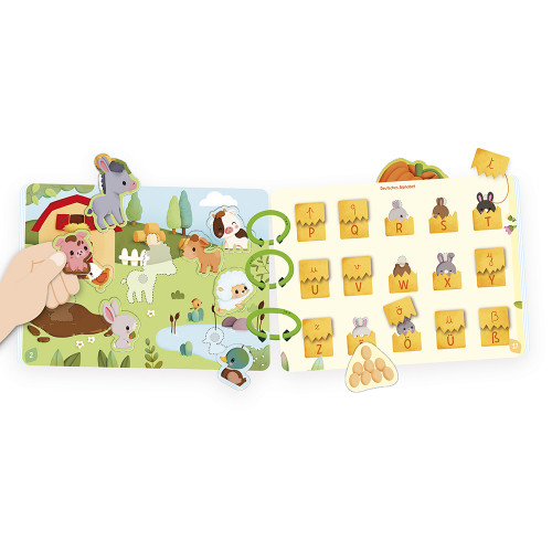 Benvenuti in fattoria! Questo libro ricco di attività, con le sue 20 pagine, introduce i bambini dai 3 anni in su alla vita in fattoria. E c'è così tanto da fare! Gli animali scorrazzano nei prati, i pulcini nascono, le verdure crescono al sole... I bambini hanno mille cose da scoprire! Troveranno tutti gli animali principali della fattoria: la gallina, la mucca, il maiale, il coniglio... e persino il tacchino! Sfogliando le pagine, i bambini familiarizzano con i loro habitat e osservano scene di vita quotidiana. Ogni attività incoraggia la manipolazione, l'osservazione e la denominazione, rendendo l'apprendimento divertente. In totale, ci sono 158 pezzi da inserire nel libro! Le illustrazioni delicate e vivaci sono pensate per stimolare la curiosità, arricchire il vocabolario e sviluppare le capacità motorie fini. E non è tutto: i bambini più grandi possono anche imparare i numeri e l'alfabeto, sia maiuscolo che minuscolo. Un vero toccasana per lo sviluppo del linguaggio e delle prime competenze scolastiche. Pratico e adattabile, questo libro di attività è rilegato con tre anelli di plastica staccabili, che permettono ai genitori di selezionare le pagine più adatte all'età e al ritmo del bambino. Un modo meraviglioso per far crescere il libro con loro! Questo giocattolo per l'apprendimento precoce è perfetto per il gioco indipendente. Grazie al suo formato a libro, è facile da portare ovunque! Dimensioni: 27 x 21 cm. Questo libro di attività è realizzato in cartoncino certificato FSC™. Che la scoperta abbia inizio!