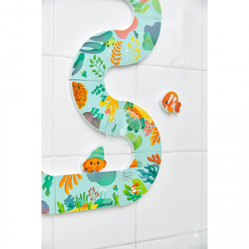 Ma dove si nascondono i cuccioli? Dai 18 mesi, i più piccoli adoreranno giocare con questo percorso a ostacoli da 13 pezzi durante il bagnetto! Questo giocattolo educativo trasforma il momento del bagnetto in una vera e propria caccia al tesoro subacquea! Ogni pezzo si incastra per creare una scena a tema marino, e i bambini si divertono a trovare i cuccioli nascosti e ad abbinarli al genitore corretto. Un'attività giocosa che stimola la vista e le capacità motorie fini dei più piccoli! Il bambino può trovare 8 animali marini: tartaruga, stella marina, balena, polpo, pesce pagliaccio, granchio, gamberetto e persino un paguro. È impossibile non innamorarsi di queste adorabili creature marine! Questo gioco di abbinamento aiuta i più piccoli a riconoscere gli animali e a iniziare a inventare le loro prime storie. Progettato in modo intelligente, basta inumidire i pezzi del percorso a ostacoli per farli aderire alle piastrelle. Davvero pratico, vero? Fornito con una retina a ventosa, i pezzi sono facili da riporre e appendere nelle vicinanze per tenerli a portata di mano durante il bagnetto.