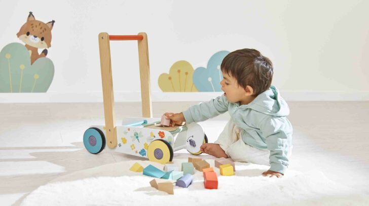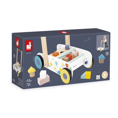 Andiamo a fare una passeggiata nel bosco! Questo grazioso carretto, con le sue illustrazioni ispirate al bosco, accompagna i bambini a partire da 1 anno mentre imparano a camminare ed esplorare il mondo. Grazie al gioco di forme all'interno del carretto, i più piccoli si divertiranno a inserire i 18 blocchi di legno negli appositi spazi. Questa attività giocosa li aiuta a imparare forme e colori, sviluppando al contempo la motricità fine e la destrezza. C'è persino un vano portaoggetti integrato nel carretto! Super pratico per portare con sé il suo giocattolo preferito a spasso! Per una maggiore sicurezza, il carretto è dotato di un sistema frenante che permette di bloccare le ruote e rilasciarle gradualmente, in modo che il bambino possa muoversi al proprio ritmo. Un altro vantaggio di questo carretto: grazie alle sue quattro silenziose ruote in gomma, può muoversi ovunque in casa, anche in soggiorno, senza lasciare segni sul pavimento! Regalare un girello al tuo bambino gli permette di imparare a camminare con sicurezza e al proprio ritmo: può alternare la camminata al gioco per imparare a orientarsi nell'ambiente ed evitare di annoiarsi con le attività proposte. Questo girello, della nostra collezione Pure di giocattoli in legno per lo sviluppo, è realizzato in legno certificato FSC™.