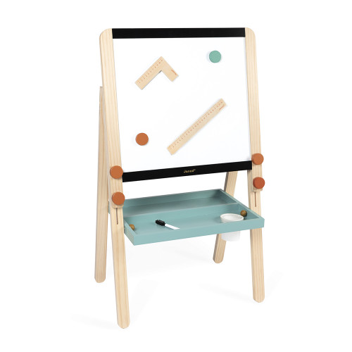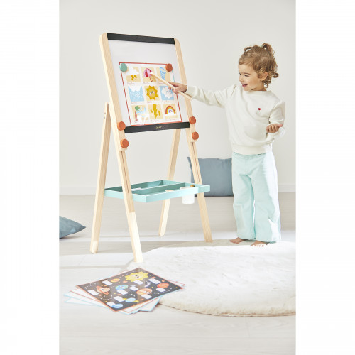 Una lavagna proprio come a scuola! Una lavagna in legno è un must nella cameretta di ogni bambino. Questa lavagna in legno è molto più di una semplice superficie per disegnare: accompagna i bambini nel loro primo apprendimento! Con i suoi due lati, offre una moltitudine di possibilità per scrivere, disegnare o esercitarsi. Per facilitare l'apprendimento e creare un'esperienza simile a quella scolastica, niente di meglio di una lavagna bifacciale dove i più piccoli possono familiarizzare sia con i pennarelli che con i gessetti! Fornita con 12 poster plastificati che si attaccano con i magneti, questa lavagna permette ai bambini di esplorare temi affascinanti come il corpo umano, lo spazio e le stagioni. Ci sono anche 2 poster a righe per esercitarsi nella scrittura a mano. E grazie alla superficie cancellabile, possono ricominciare da capo più e più volte! Questa lavagna include: 3 gessetti, 1 pennarello cancellabile, 1 righello, 1 squadra, 2 magneti e 2 contenitori. Tutto è progettato per incoraggiare i bambini a ricreare l'ambiente della classe a casa! Questo tipo di gioco permette loro di sentirsi apprezzati, indipendenti e orgogliosi di condividere ciò che imparano. E perché non insegnare ai loro peluche? Una tavola divertente ed educativa, perfetta per sviluppare la concentrazione e imparare divertendosi! Super pratica, la tavola è regolabile in altezza, perfetta per crescere con il bambino! Pensata per bambini dai 3 anni in su, questa tavola è realizzata in legno certificato FSC™.