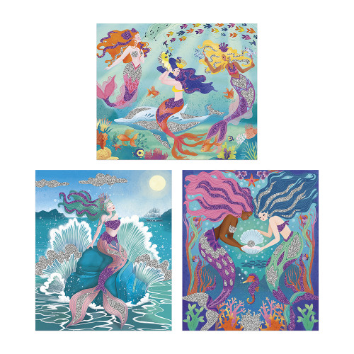 Immergiti nel regno delle sirene e scatena la sua magia scintillante! Questo kit creativo è ideale per bambini dai 5 anni in su. Applicando gradualmente i glitter alle illustrazioni incluse, i bambini svilupperanno la loro creatività, destrezza e pazienza. Sapientemente progettati, i glitter sono conservati in sacchetti richiudibili con zip per mantenerli al sicuro e asciutti tra un utilizzo e l'altro! La punta a "cucchiaio" dell'attrezzo incluso facilita il reinserimento dei glitter. Un libretto è incluso per guidare i bambini passo dopo passo attraverso l'attività! Questo set creativo permette di decorare tre immagini a tema sirena utilizzando aree autoadesive ricoperte di glitter biodegradabili. I bambini usano l'attrezzo e la sua punta per staccare la carta protettiva che protegge le aree da decorare. Quindi, basta cospargere i glitter: un risultato splendido che delizierà e affascinerà grandi e piccini! Il kit contiene: 3 tele di 21 x 25 cm, 2 sacchetti di glitter (argento e viola), 1 attrezzo di plastica con 2 punte diverse e 1 libretto di istruzioni. Tra la scoperta di un tesoro del mare, una notte di luna piena tra le onde e l'incantevole melodia delle sirene che cantano e suonano per l'oceano, lasciatevi trasportare dal loro mondo meraviglioso e magico! Dalla collezione "Les Ateliers du Calme", questa attività è perfetta per offrire al vostro bambino un momento di relax. Preparate i glitter, artisti!