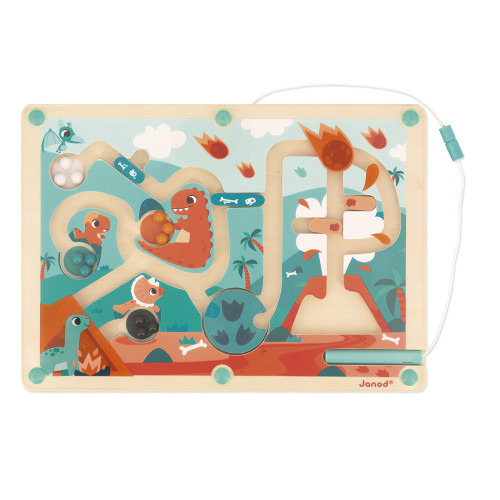 Attenzione alle palle di fuoco! I dinosauri hanno in serbo per te un sacco di sorprese in questa pista magnetica per biglie! Sviluppa le tue capacità motorie fini con questo divertente gioco di destrezza per bambini dai 2 anni in su. Lo scopo del gioco? Esplorare il labirinto e guidare le 12 biglie colorate nelle zone corrispondenti usando lo stilo magnetico! Le biglie blu devono andare nel guscio del cucciolo di dino , quelle arancioni tra le zampe del gigantesco tirannosauro e così via... Ma fai attenzione a usare la ghiera per non rimanere incastrato! Le impronte ti aiutano a trovarlo. Grazie ai piedini in silicone antiscivolo, non c'è il rischio di scivolare o che il gioco si muova mentre il tuo bambino gioca. Devi tornare indietro? Niente panico, probabilmente è una delle quattro barriere al movimento! Ma non è tutto: avrai anche la piacevole sorpresa di scoprire due passaggi segreti. Questo gioco è perfetto per sviluppare le capacità motorie fini e imparare a tenere correttamente una matita. Nel suo formato 25 x 18 cm, questo gioco di pazienza e precisione è realizzato in legno certificato FSC™.